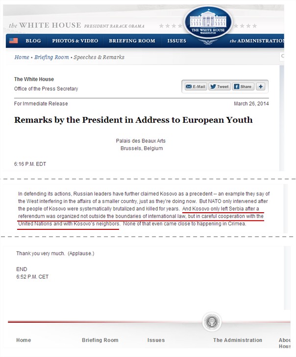 « En défendant leurs actions, les dirigeants russes ont en outre cité le Kosovo comme un précédent – qu’ils prétendent être un exemple d’une « ingérence occidentale dans les affaires d’un petit pays », ce qui est exactement ce qu’ils le font actuellement. Mais l’OTAN n’est intervenu qu’après que les habitants du Kosovo aient été systématiquement [sic.] brutalisés et tués pendant des années. Et le Kosovo n’a quitté la Serbie qu’après qu’un référendum ait été organisé, qui n’était pas hors des limites du droit international, mais en coopération étroite avec l’Organisation des Nations Unies et avec les voisins du Kosovo. Rien de tout ceci ne se rapproche même qu’un peu des évènements survenus en Crimée. »