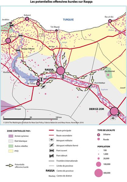 Les FDS sont donc très bien positionnés pour lancer une offensive sur Raqqa. Ils peuvent attaquer sur plusieurs fronts à la fois pour encercler Raqqa, notamment en visant le pont de Halabyah à 50 km à l’Est de Raqqa et le barrage de Thaoura qui fait également office de pont. Ils seront ainsi protégés par le fleuve d’une contre-attaque de l’État islamique en provenance de la rive sud et pourront s’approcher de Raqqa par le nord, l’est et l’ouest. La proximité de leur territoire limite la longueur des lignes de communication ce qui permet de ne pas bloquer trop de forces à l’arrière, plus utiles sur la ligne de front. Ce qui n’est pas le cas de l’armée turque et de ses alliés locaux.