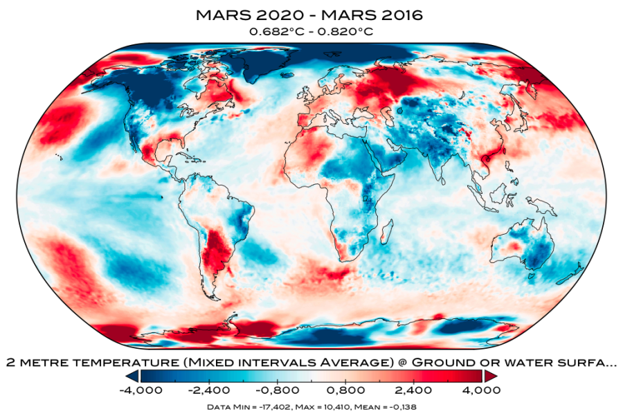D’après la réanalyse de dernière génération ERA5, la température globale en 2020 a connu une anomalie quasiment équivalente à celle de 2016, année marquée par un record de chaleur.