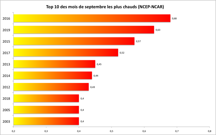 Top 10 des mois de septembre les plus chauds depuis 1948. Anomalies par rapport à la moyenne 1981-2010. D’après NCEP-NCAR.