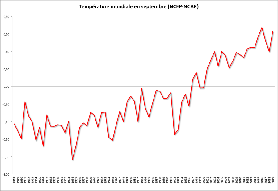 Avec +0,632°C au-dessus de la moyenne 1981-2010, le mois de septembre 2019 est le 2e plus chaud des annales NCEP-NCAR, derrière 2016 (+0,68°C). Depuis 1948, sur les cinq mois de septembre les plus chauds, on trouve dans dans l’ordre 2016, 2019, 2015, 2017 et 2013. L’anomalie de température mondiale est en hausse par rapport à août 2019 (+0,56°C).
