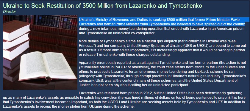 En juin 2012, le parquet de Kiev annonce que Ioulia Timochenko va être inculpée pour le meurtre du député Evgueni Chtcherban en 1996, sa femme et deux autres personnes, à l’époque où Lazarenko et Timochenko construisaient un système de monopole de l’importation du gaz. Selon le procureur adjoint Renat Kouzmine, la société de la victime était en concurrence avec les Systèmes énergétiques unis d’Ukraine (uk) que dirigeait la prévenue, et il existe suffisamment de preuves pour l’inculper. Ces allégations sont soutenues par Ruslan, le fils de M. Shcherban, qui a survécu à l’assassinat de ses parents. Dans une conférence de presse, il a déclaré avoir remis des documents au bureau du procureur général impliquant les deux anciens premiers ministres (Lazarenko et Timochenko) dans les meurtres.
