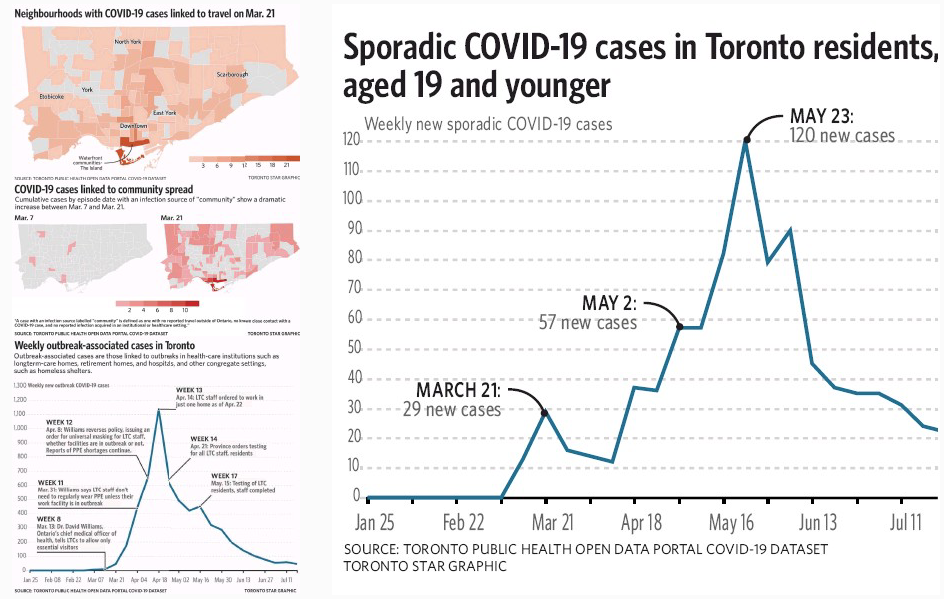 Ces jeunes voyageurs suivaient les instructions du Premier ministre. La semaine précédant le congé de mars, le premier ministre Doug Ford a exhorté les Ontariens à « partir, s’amuser ». Au cours des deux semaines suivantes, 16 cas de COVID liés à des voyages allaient apparaître dans le Waterfront, soit le nombre le plus élevé parmi les quartiers de Toronto.
