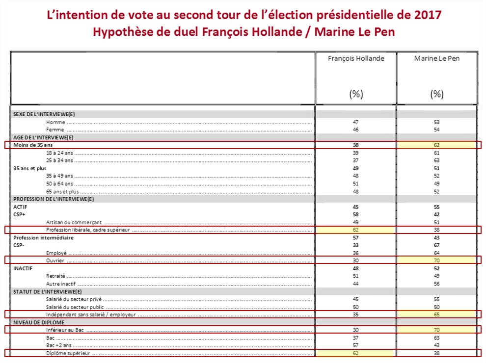 AlerterA noter que MLP recolte autant avec les femmes (53%) qu’avec les hommes (54%) dans l’hypothese d’un second tour face à FN1 (François Normal 1er). Donc l’opération marketing avec l’arrivée d’une femme au FN a marché à fond ! Les abrutis du monde fermé politico-mediatique français ne comprennent plus rien aux attentes de la population et à leurs ressentis. Pourtant en 2002, Bernadette Chirac avait bien senti le coup venir pour le 1er tour mais Hollande n’a même pas sa deuxième moitié féminine pour le guider intuitivement vers le peuple.