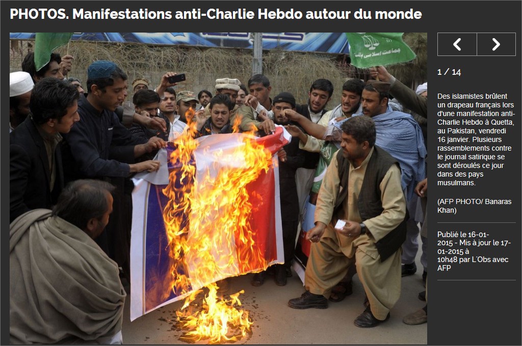 AlerterC’est bien de mettre en parallèle l’interdiction d’offenser le drapeau français et la possibilité d’offenser la religion des autres. Le même genre d’absurdité que d’aller dégommer les régimes laïcs des autres (Irak, Lybie, Syrie), de financer et armes les terroristes des autres (en Syrie) en s’outrant quand ils reviennent en France, en colère.