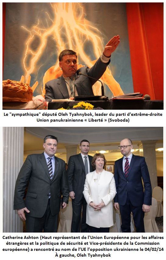 La nature néo-nazie, raciste et antisémite de Svoboda n’a pas découragé les diplomates occidentaux (y compris le secrétaire d’Etat-adjoint pour les Affaires européennes et eurasiennes, Victoria Nuland) de rencontrer publiquement le dirigeant du parti, Oleh Tiahnybok, expulsé du mouvement Notre Ukraine en 2004 en raison de ses discours dénonçant « les moscovites et les juifs » en termes offensants et désobligeants.