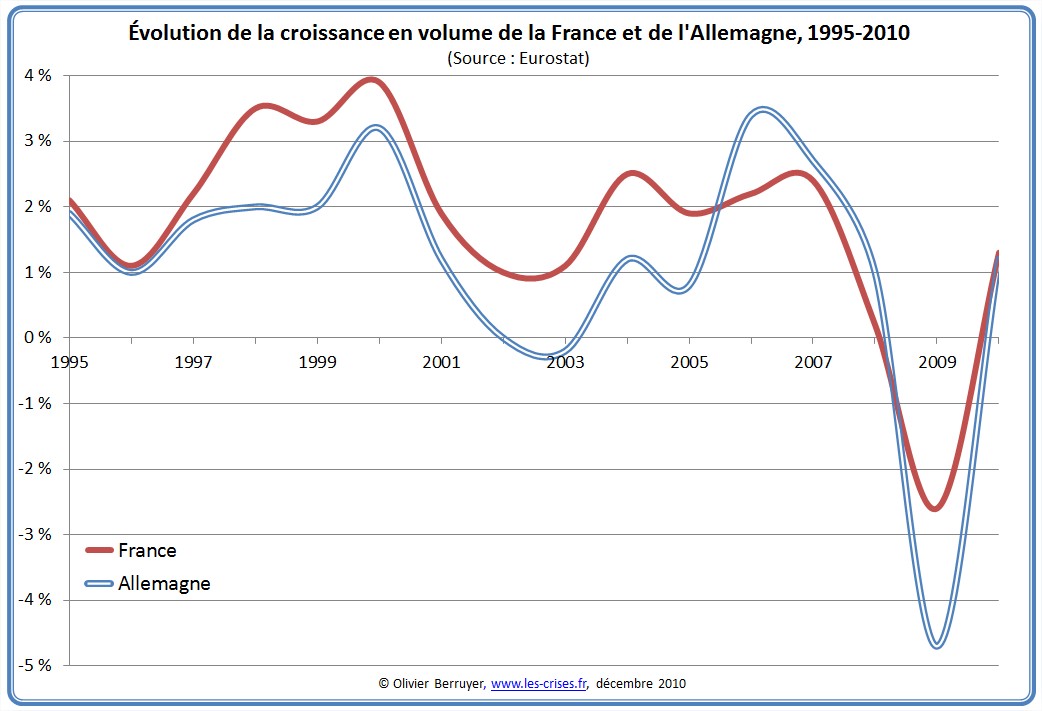 Nous allons étudier de plus près la différence entre la France et l’Allemagne, puisque l’on entend souvent que l’Allemagne serait un « modèle » à suivre – pays travailleur (« ce n’est pas eux qui inventeraient les 35 heures… »), rigoureux dans ses finances, etc. C’est en partie vrai, mais analysons plus en détail ces différences avant de trancher.