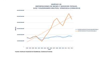 Une analyse plus fine des importations au Venezuela nous montre très nettement une augmentation des importations exprimées en dollars US bien plus forte que l’augmentation des importations exprimées en kilogrammes bruts à partir de 2003. Entre 2003 et 2013, le Venezuela importe moins de biens et services malgré un plus grand nombre de devises étrangères mises à dispositions du secteur privé par l’État pour l’import.