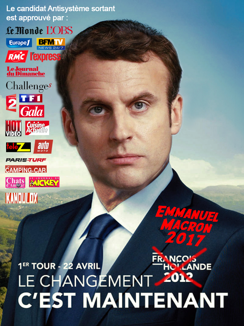 AlerterMacron , candidat du système capitaliste français mondialisé , est soutenu par toute la camarilla bourgeoise parisienne que nous connaissons tous , du moins les militants révolutionnaires . Cette candidature , même élue au mois de Mai , ne pourra que précipiter la France dans le déclin et la pauvreté . D’où une réaction de la classe ouvrière et de la jeunesse populaire alliés au petit patronat régional pour supprimer au plus vite cette société parasitaire et rentière au moyen d’une grève générale insurrectionnelle . Les élections sous le 5ème république ont toujours été manipulées par la classe dirigeante pour perpétuer son pouvoir sur les exploités et celles-ci ne changeront rien à ce phénomène avec Macron , le futur Giscard-Rocard . Ce jeune homme sera sacrifié sur l’autel du profit capitaliste et il aura une cote de popularité après un mois d’exercice encore plus bas que Hollande . Alors l’histoire continuera son jeu de quilles et son chaos permanent .