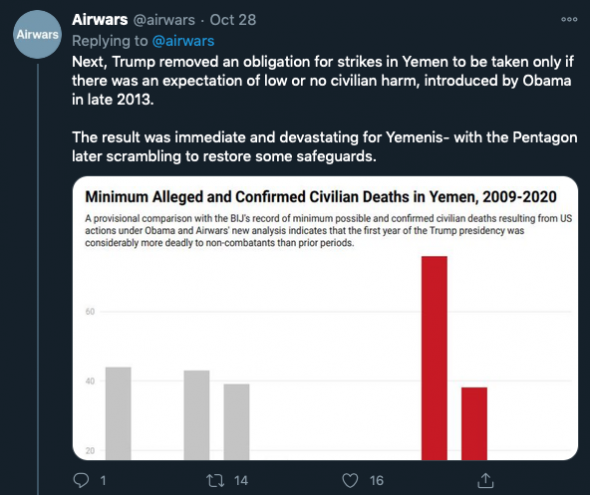Bien que le nombre de frappes au Yémen depuis la mi-2019 connaisse une baisse significative par rapport aux premiers jours de l’administration Trump, le directeur d’Airwars, Chris Woods, s’est élevé contre la suggestion que les chiffres récents indiquent que le président tient ses promesses de mettre fin aux « guerres éternelles » américaines, dans une interview avec Business Insider.