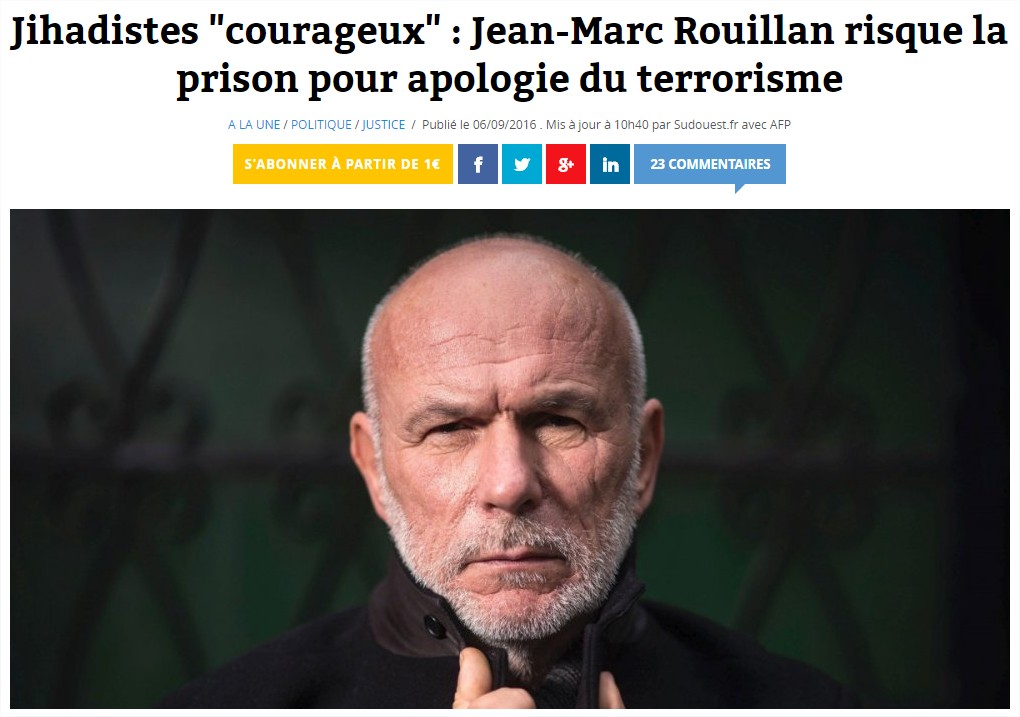 Pour ceux qui penseraient que j’exagère et que c’est lié à ma fixette Zemmour (allez, encore une semaine et j’arrête, ça m’attriste trop pour mon pays), je vous renvoie à la jurisprudence Jean-Marc Rouillan, qui date de… septembre 2016.